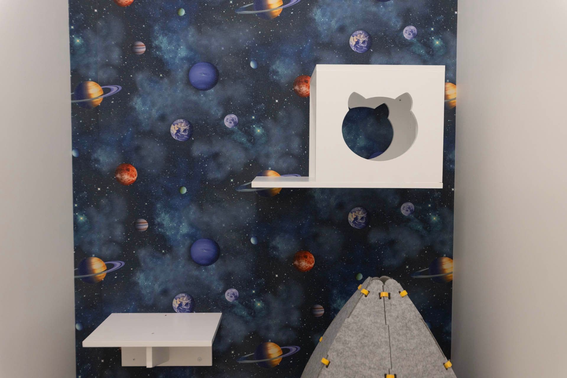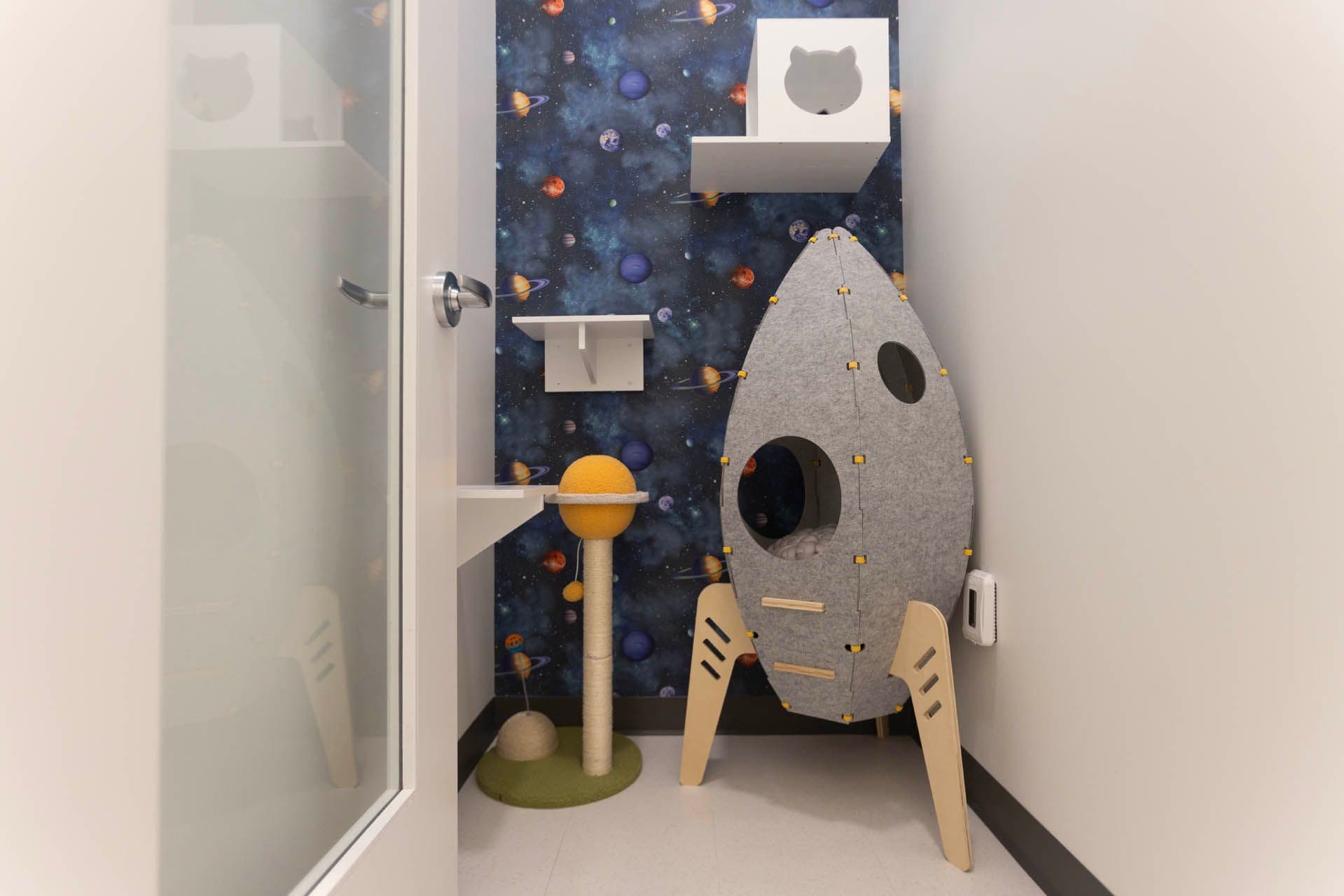 5, 4, 3, 2, 1 BLAST OFF! Your kitty will feel out of this world on a trip of a lifetime in the solar system suite. 200+ cubic feet of coziness for your cat to enjoy!